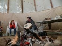 Le potier et la peintre installent donc leurs expositions dans le tipi chauffé par un bon feu de bois.