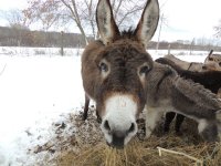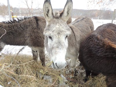 Les premiers gourmands sont le mulet qui reste dehors pour me guetter, dès qu’ils entendent ouvrir la porte de la grange, Chocolat, Charlie, Garou sortent suivi de Paul et ils observent mes préparatifs pour avoir les premières bouchées de foin !