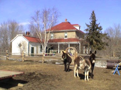 Le lendemain soir, on arrive dans la ferme à la tombée de la nuit. Personne, un mot sur la porte nous indique que les ânes sont près des granges et nous invite à aller les voir. Je pars explorer les parcs avoisinants et je ne vois que chevaux et moutons. Je me mets à penser ’’âne ’’ je balaie du regard les environs et je vois une grange avec une ouverture sombre et béante qui me regarde d’un oeil noir au milieu d’un océan de boue. Une cachette idéale pour des ânes timides... Je m’approche et découvre six yeux curieux qui me dévisagent dans l’obscurité. Je rentre dans le bâtiment et avec douceur, pousse les mamans vers l’extérieur. La maman et ses deux grandes filles sortent. La maman est un peu décrépie et déplumée et elle fait bien plus que les douze ans qu’on lui prête, mais elle est gentille et pas trop peureuse, mais les filles sont magnifiques. Noir, poils mi-longs, museau blanc, style âne du Berry. Très costaude, très bien charpentée, une est calme et gentille, elle se laisse caresser, l’autre nerveuse, curieuse et inquiète.