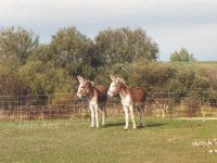 Barney et Câline n’ont jamais été dressés et comme la majorité des ânes que j’ai rencontré dans les environs, ils n’ont eu de contact qu’avec des vaches. Chaque contact avec des hommes se soldait par des brutalités (chocs électriques, coups de piques ou de bâtons, torsion de la queue...) afin de les faire avancer, monter dans le camion... Leur confiance en l’être humain est donc des plus limitées... Le transport de Câline et Barney vers chez moi fut une véritable séance de torture pour ces pauvres bêtes. Malgré tout, nous les promenons dans leur parc, les brossons et jouons avec afin de leur redonner un peu de confiance en l’être humain et les résultats sont encourageant.