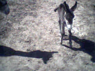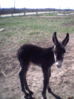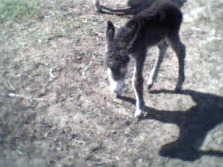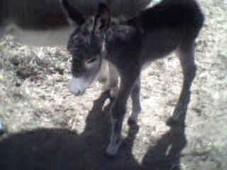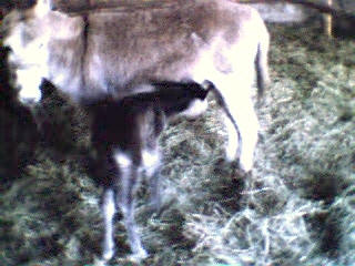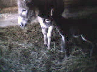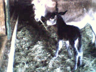 Le 11 mai 2002, vers 10 heures du matin, je me rends à la grange pour soigner les animaux et là, ho surprise, j’ai la joie de découvrir le bébé de Sissi dans la grange qui tétait goulûment sa maman. Il n’avait que quelques heures. Câline et Cloclo étaient dans l’embrasure de la porte et regardaient intéressés et curieux leur nouvelle copine et Zigo, le papa grignotait quelques brins de paille à proximité en zieutant du coin de l’oeil sa fille. Je n’ai que quelques photos numériques faites dans la pénombre et assez mauvaises... que je m’empresserais d’ici une semaine de remplacer par des photos argentiques dès qu’elles seront développées.