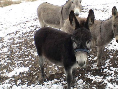 L’hiver a été rude avec une semaine avec du moins 38 à moins 40 ! des vents violents, tout ce qu’un âne adulte endure sans grand entrain, alors imaginez la petite Chloé... Heureusement, la nature a bien fait les choses, les jeunes ont une abondante fourrure qui leur permet d’endurer tout cela avec stoïcisme. Chloé a été mon rayon de soleil hivernal ! Toujours gentille et affectueuse, ne faisant jamais la gueule contrairement à sa maman, la jalouse Sissi, qui a pris ombrage de l’arrivée de Joséphine et du petit Arthur, elle a su avec sa grande copine Molly dispenser joie et bonne humeur à toute la famille. Arnaud, 4 ans, qui avait un peu peur des ânes a été conquis et il ne se passe plus de journées sans qu’il aille lui faire une caresse et un bisou. Chloé a sympathisé avec son nouveau copain Arthur.