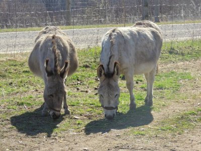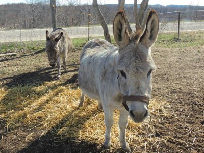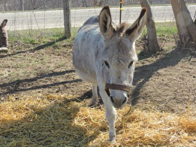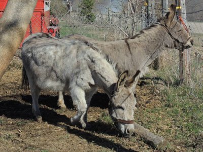 Deux magnifiques petits ânes gris, une femelle Julietta et un hongre Garou.