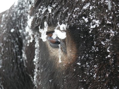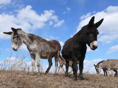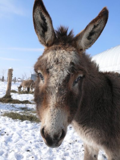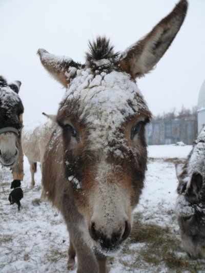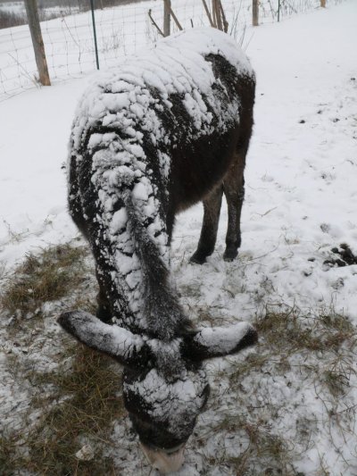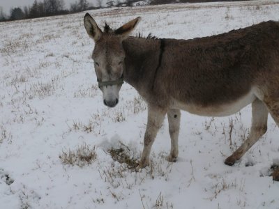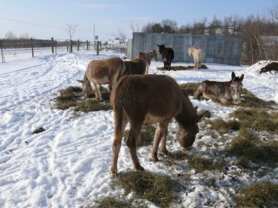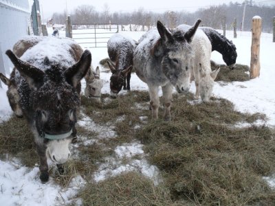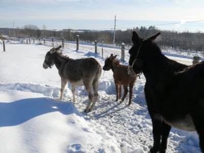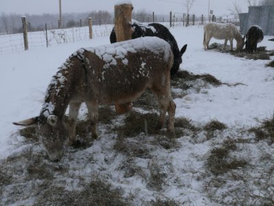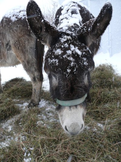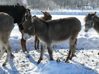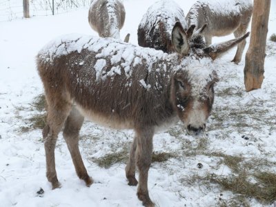 L’hiver, tant qu’il n’y a pas de neige, les ânes restent au pâturage. Ils sont nourris à l’asinerie et se promènent à volonté. Par contre dés qu’il y a de la neige, d’eux même, ils préfèrent rester dans le parc d’hiver. Protégés des vents dominants, ils ont un abri étanche aux intempéries qu’ils n’utilisent qu’en cas de mauvais temps. Ils préfèrent, et de loin, passer leurs journées dehors même par les plus grands froids.
