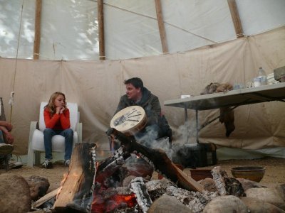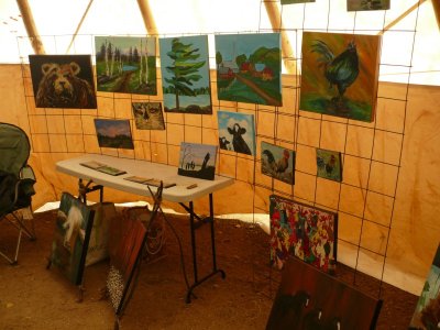 Le potier et la peintre installent donc leurs expositions dans le tipi chauffé par un bon feu de bois.