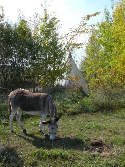 La journée a été animée. Sébastien a fait des animations avec son tambour, il y a eu un concours de pétanque et tous les visiteurs ont été rendre visite aux ânes qui broutaient autour du tipi.
