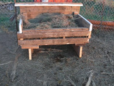 J’ai bâti avec du bois non traité, non peint, de récupération une mangeoire de 12 mètres de longueur, abritée des vents et contre un couloir de service.