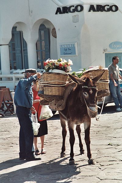 Un âne bâté pour le transport et le commerce des fleurs à Myconos.