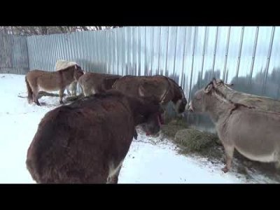 Je pars nourrir les ânes et je donne le foin le long des murs anti-vents, indispensables en hiver quand on a des ânes.
