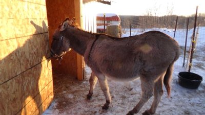 Travailler, couper, visser par moins 20 est une expérience intéressante dont Capucine n’a pas perdu une miette. J’ai mis de belles charnières toutes neuves, des vis inox… manipuler des outils en métal, des vis à main nue par ce froid est un bon test de dextérité. Il faut aller vite, car les doigts gèlent vite… et avec mes grosses moufles, je ne peux pas bosser, Une fois fini, Mimosa et Capucine ont inspectées mon œvre et j’ai remarqué que j’ai oublié d’acheter le loquet ! Je vais fouiller dans mes bébelles, j’en trouverai bien un quelque part.