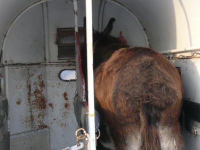 Il est monté dans la remorque sans problèmes Il a eu peur pendant le transport. On a dû faire des arrêts, il était trempé de sueur. Il a même fait danser la remorque... on a dû le calmer...