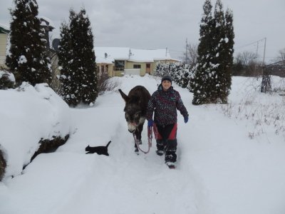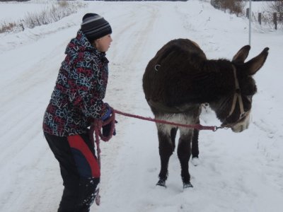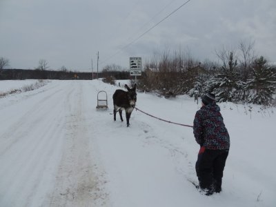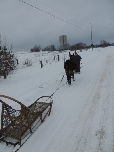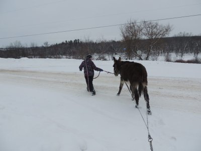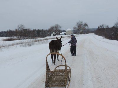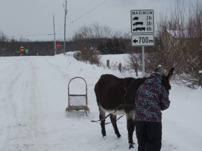 C’est la première sortie de Paul cette hiver avec le traine-âne (un traineau à chien). J’ai déjà fait plusieurs sorties avec Paul, une avec des paniers, une à la longue et j’ai commencé à l’éduquer pour l’équitation.