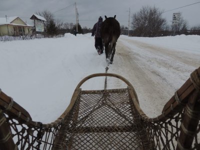 On quitte le parc, on s’engage sur le chemin, on dépasse la maison et on arrive dans un couloir de vent glacial. Paul refuse d’avancer. Christian m’a dit qu’il a déjà rencontré le même problème l’année dernière. J’ai essayé par la parole, par la persuasion, j’ai tiré, je l’ai fais zigzaguer, je me suis accroupi devant lui en l’appelant, sans aucun résultat. Sans cesse, il regardait vers la maison comme pour nous dire, on rentre ?