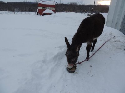 Après 20 minutes de trajet je décide de tester son écoute en pliant la longe et en la posant sur son encolure . Il es très attentif et me suis très bien à la voix.. Paul es très sensible au ton de ma voix. Lorsqu’il s éloigne pour aller brouter des herbes, un petit ton réprobateur le ramène. Si cela ne suffit pas, je fais semblant de prendre sa longe et la main sous le museau suffit à le ramener. Tout au long de la balade, je le motive et je l’encourage d’une voix douce et joyeuse. Nous avons fait une très belle promenade d’environ une heure sans le tenir et à part quelques écarts où il a tenté de grignoter des herbes sèches qui dépassaient de la neige, la sortie s’est très bien passée. À l’arrivée, il a eu un bon bol d orge pour le féliciter pour son plus grand bonheur.