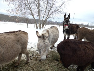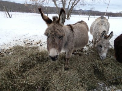 Nourrir les ânes en pleine tempête est souvent « â€¯sportif  ». Il faut lutter contre le vent, éviter de laisser partir le foin au vent et casser la glace dans les bacs, mettre de l’eau plusieurs fois par jour…