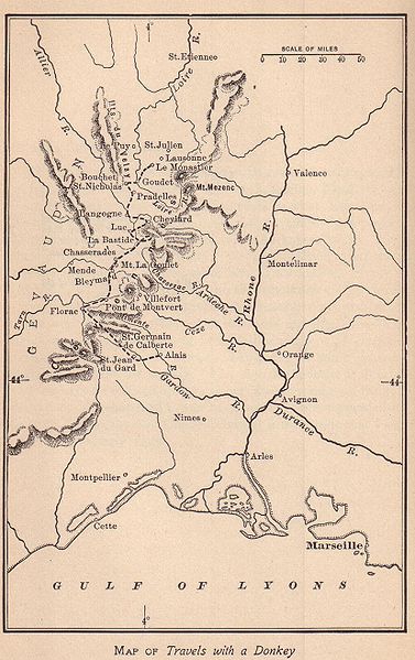 Suite à un chagrin d’amour, l’écrivain écossais raconte la traversée des Cévennes à pied qu’il entreprend en 1878. Parti du Monastier en Haute-Loire, il traverse la Lozère pour atteindre douze jours après Saint-Jean-du-Gard ce qui représente un voyage de 195 km environ. La randonnée et le camping n’existant pas à cette époque, il se fait fabriquer un sac de couchage « primitif », s’encombre de tout un bric-à-brac plus ou moins utile et achète à un paysan une ânesse qu’il baptise Modestine. N’ayant aucune expérience de la manière de mener un âne, il connu de nombreux déboires. Les débuts furent difficiles et racontés avec beaucoup d’humour, mais très vite l’écrivain s’attacha à sa compagne de voyage.