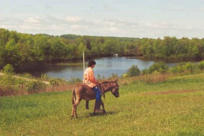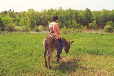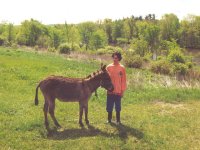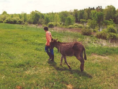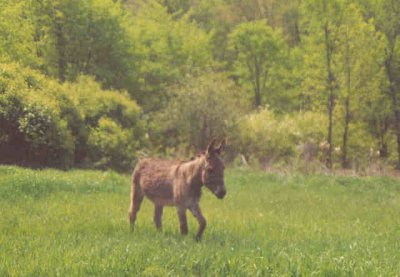 En novembre 1999, en nous promenant sur la 148, nous voyons un âne gris/brun de deux ans, attaché à une chaîne au milieu d’un champ sous une pluie battante. Nous nous arrêtons, nous allons le caresser et nous sympathisons. Nous essayons de trouver ses maîtres en vain. Personne ! Quelques jours après, ses propriétaires nous appellent au téléphone, ils nous ont vu discuter avec l’âne et ont reconnu notre voiture. Ils veulent vendre l’âne, mais beaucoup trop cher. Nous refusons leur prix avec un serrement de cœr. Cinq minutes plus tard, le téléphone re-sonne, ils baissent de moitié le prix. Nous acceptons et 1 heure après, il arrive dans un vieux pick-up. Outre l’hiver qui arrive, ce qui les a incités à vendre rapidement c’est la saison de la chasse. Ils ont été obligés de mettre un réflecteur fluo à l’âne pour ne pas que les chasseurs le tirent. À quelques kilomètres de là, un âne, attaché lui aussi à une chaîne, prés d’une maison a connu une fin tragique. Des chasseurs l’on prit pour un chevreuil et l’on abattu !!!