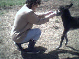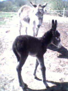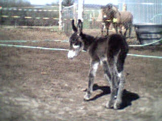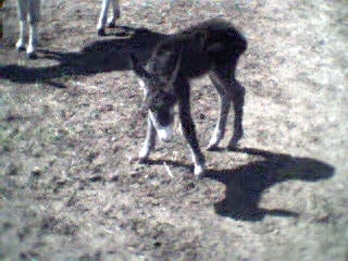 Le 11 mai 2002, vers 10 heures du matin, je me rends à la grange pour soigner les animaux et là, ho surprise, j’ai la joie de découvrir le bébé de Sissi dans la grange qui tétait goulûment sa maman. Il n’avait que quelques heures. Câline et Cloclo étaient dans l’embrasure de la porte et regardaient intéressés et curieux leur nouvelle copine et Zigo, le papa grignotait quelques brins de paille à proximité en zieutant du coin de l’oeil sa fille. Je n’ai que quelques photos numériques faites dans la pénombre et assez mauvaises... que je m’empresserais d’ici une semaine de remplacer par des photos argentiques dès qu’elles seront développées.