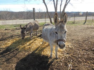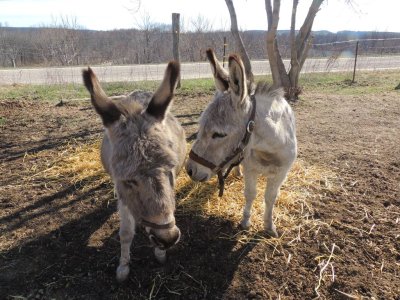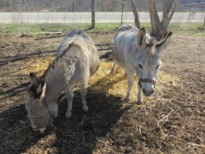 Deux magnifiques petits ânes gris, une femelle Julietta et un hongre Garou.