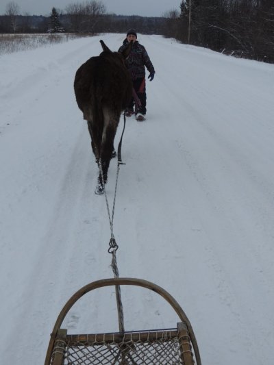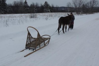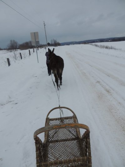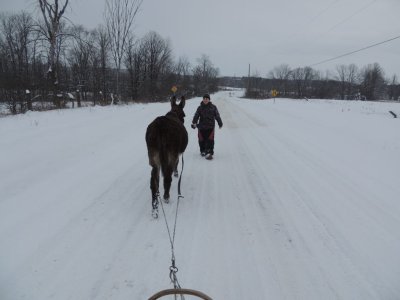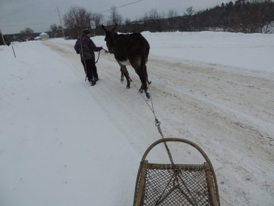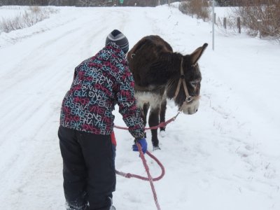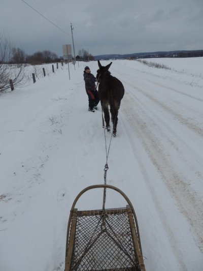 C’est la première sortie de Paul cette hiver avec le traine-âne (un traineau à chien). J’ai déjà fait plusieurs sorties avec Paul, une avec des paniers, une à la longue et j’ai commencé à l’éduquer pour l’équitation.