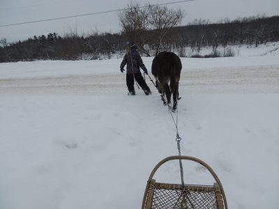 Puisqu’il a déjà travailler avec le traîneau je n’ai pas eue à le désensibiliser au harnais aux courroie sur le côtés des ses flancs. Il a l’habitude de tirer des charges, des traineaux.