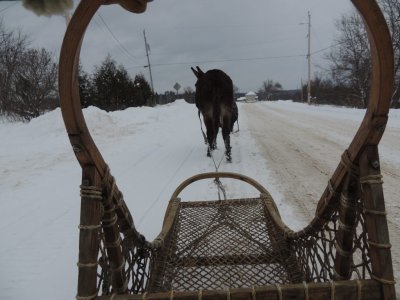 On quitte le parc, on s’engage sur le chemin, on dépasse la maison et on arrive dans un couloir de vent glacial. Paul refuse d’avancer. Christian m’a dit qu’il a déjà rencontré le même problème l’année dernière. J’ai essayé par la parole, par la persuasion, j’ai tiré, je l’ai fais zigzaguer, je me suis accroupi devant lui en l’appelant, sans aucun résultat. Sans cesse, il regardait vers la maison comme pour nous dire, on rentre ?