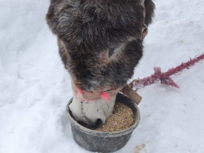 Après 20 minutes de trajet je décide de tester son écoute en pliant la longe et en la posant sur son encolure . Il es très attentif et me suis très bien à la voix.. Paul es très sensible au ton de ma voix. Lorsqu’il s éloigne pour aller brouter des herbes, un petit ton réprobateur le ramène. Si cela ne suffit pas, je fais semblant de prendre sa longe et la main sous le museau suffit à le ramener. Tout au long de la balade, je le motive et je l’encourage d’une voix douce et joyeuse. Nous avons fait une très belle promenade d’environ une heure sans le tenir et à part quelques écarts où il a tenté de grignoter des herbes sèches qui dépassaient de la neige, la sortie s’est très bien passée. À l’arrivée, il a eu un bon bol d orge pour le féliciter pour son plus grand bonheur.